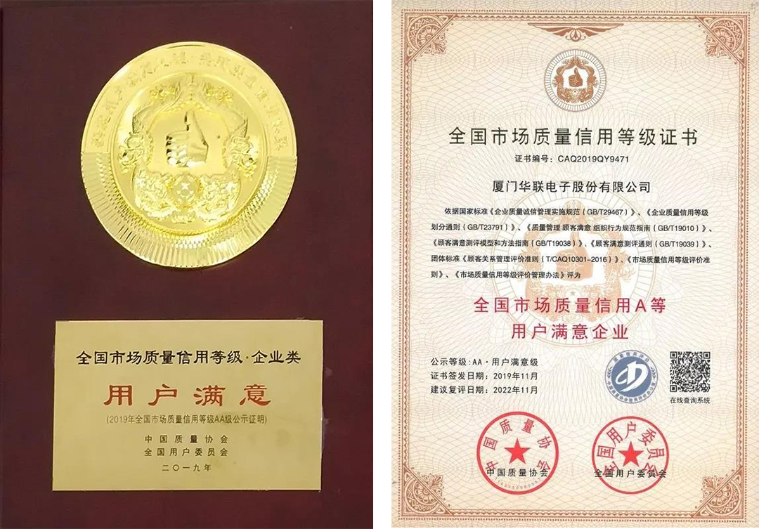 華聯(lián)電子第四次獲評(píng)“全國(guó)市場(chǎng)質(zhì)量信用等級(jí)AA級(jí)用戶滿意企業(yè)”