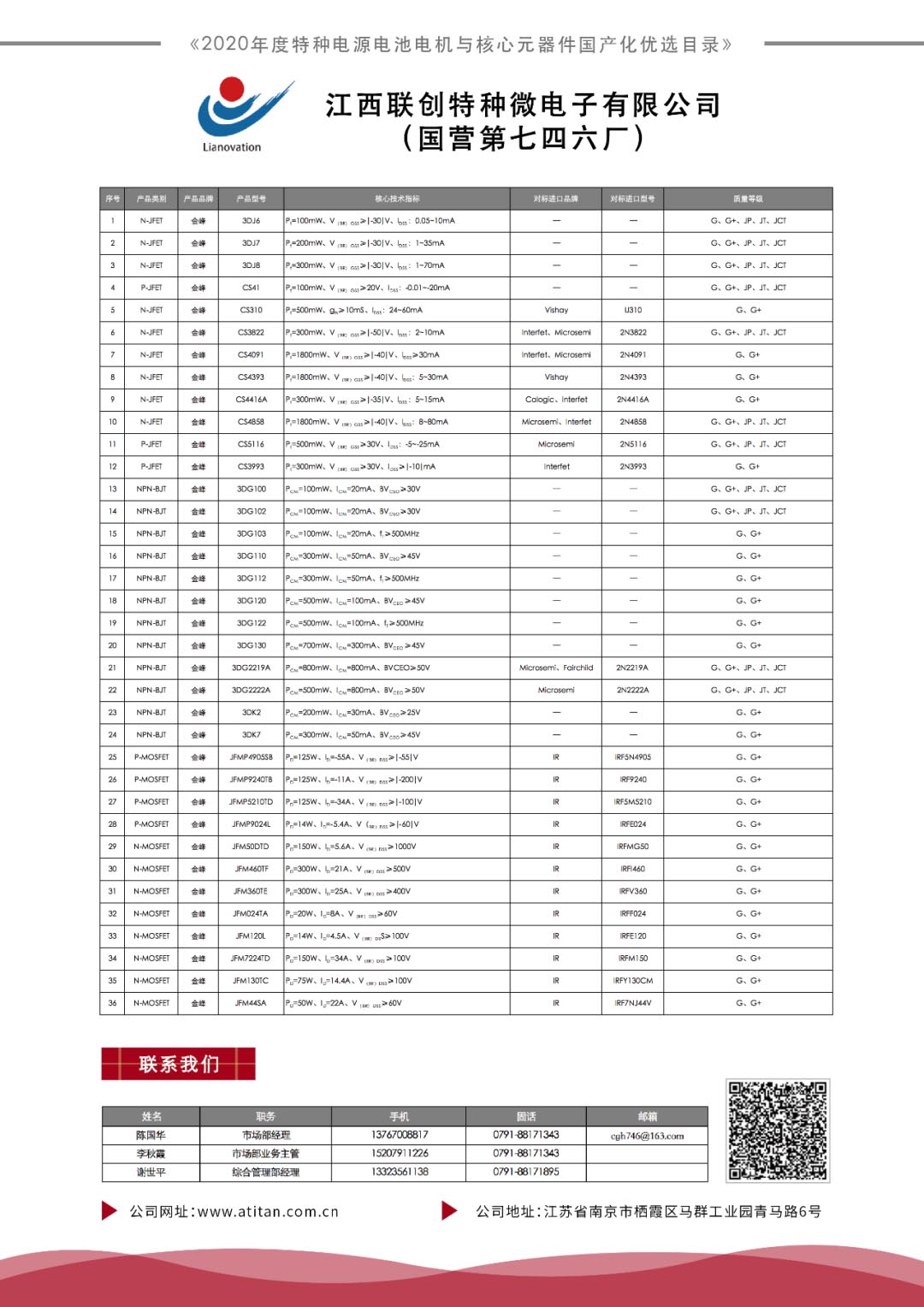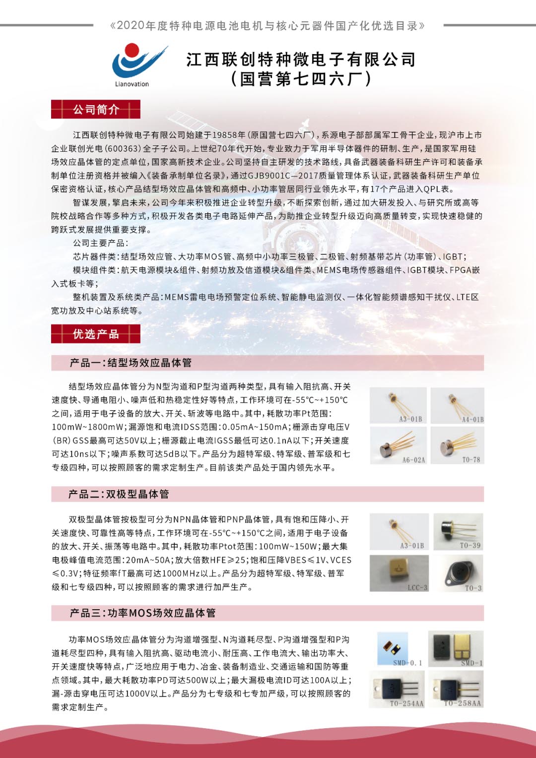 恭喜集團下屬單位江西聯(lián)創(chuàng)特種微電子有限公司(國營第七四六廠)入編《2020年度特種電源電池電機與核心元器件優(yōu)選目錄》