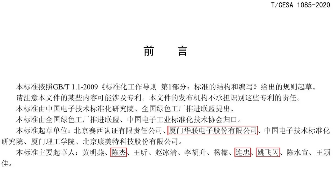 廈門華聯(lián)電子股份有限公司作為第二起草單位,參與起草了《家居智能控制器制造業(yè)綠色工廠評(píng)價(jià)要求》T/CESA 1085—2020。該標(biāo)準(zhǔn)起草單位有:北京賽西認(rèn)證有限責(zé)任公司、廈門華聯(lián)電子股份有限公司、中國電子技術(shù)標(biāo)準(zhǔn)化研究院、廈門理工學(xué)院、北京康美特科技股份有限公司。