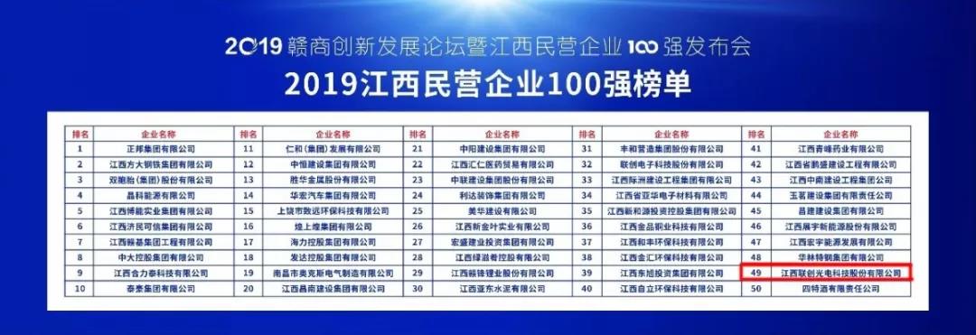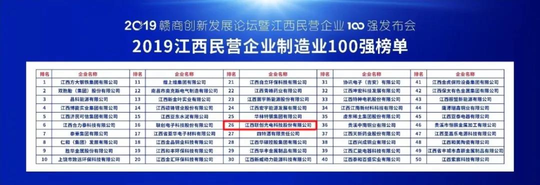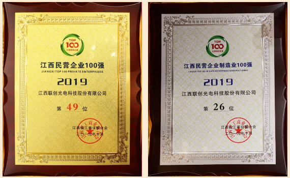聯(lián)創(chuàng)光電入選2019江西民營(yíng)企業(yè)、江西民營(yíng)企業(yè)制造業(yè)100強(qiáng)榜單