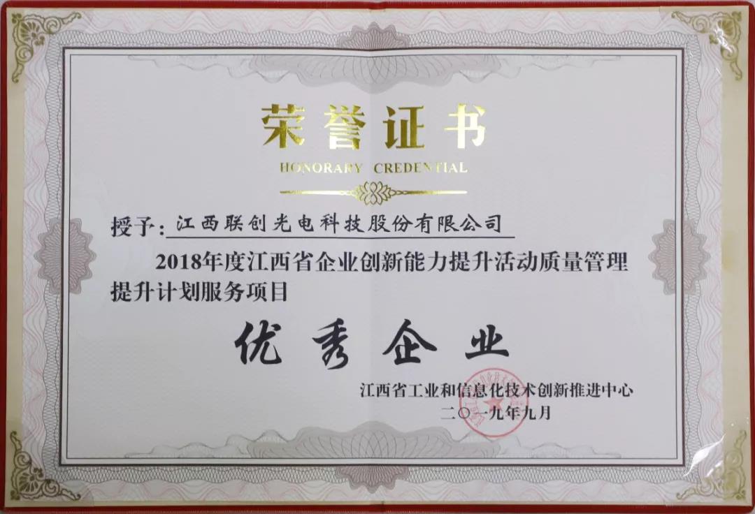 2018年,公司總部牽頭子公司——江西聯(lián)創(chuàng)致光科技有限公司共同參與2018年度企業(yè)創(chuàng)新能力提升活動。此次獲獎表明2018年公司在質(zhì)量管理提升方面所獲得的經(jīng)濟和社會效益得到了相關(guān)主管部門的認可和肯定。公司希望各子公司以此榮譽為激勵,對標先進,不斷深化推進質(zhì)量管理(QC項目),促進各子公司的產(chǎn)品質(zhì)量和管理水平不斷提高。