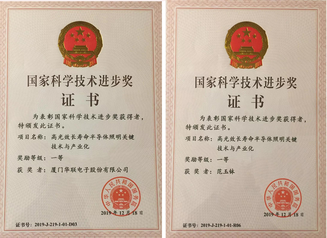 1月10日上午,2019年度國(guó)家科學(xué)技術(shù)獎(jiǎng)勵(lì)大會(huì)在北京人民大會(huì)堂隆重舉行,會(huì)上共公布國(guó)家科學(xué)技術(shù)進(jìn)步獎(jiǎng)185項(xiàng)。廈門華聯(lián)電子股份有限公司作為第三序列完成單位與中國(guó)科學(xué)院半導(dǎo)體研究所、三安光電股份有限公司、國(guó)家半導(dǎo)體照明工程研發(fā)及產(chǎn)業(yè)聯(lián)盟、廈門光莆電子股份有限公司等多家單位聯(lián)袂參與的“高光效長(zhǎng)壽命半導(dǎo)體照明關(guān)鍵技術(shù)與產(chǎn)業(yè)化”項(xiàng)目榮獲國(guó)家科學(xué)技術(shù)進(jìn)步獎(jiǎng)一等獎(jiǎng),華聯(lián)電子榮譽(yù)董事長(zhǎng)范玉缽作為獲獎(jiǎng)項(xiàng)目主要完成人之一同時(shí)接受表彰。