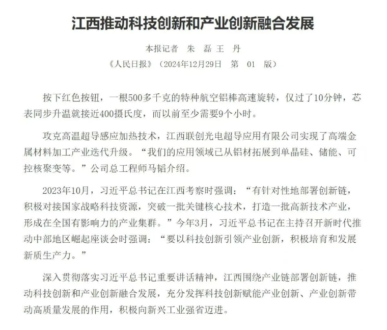 攻克高溫超導(dǎo)感應(yīng)加熱技術(shù),江西聯(lián)創(chuàng)光電超導(dǎo)應(yīng)用有限公司實(shí)現(xiàn)了高端金屬材料加工產(chǎn)業(yè)迭代升級。“我們的應(yīng)用領(lǐng)域已從鋁材拓展到單晶硅、儲(chǔ)能、可控核聚變等。”公司總工程師馬韜介紹。