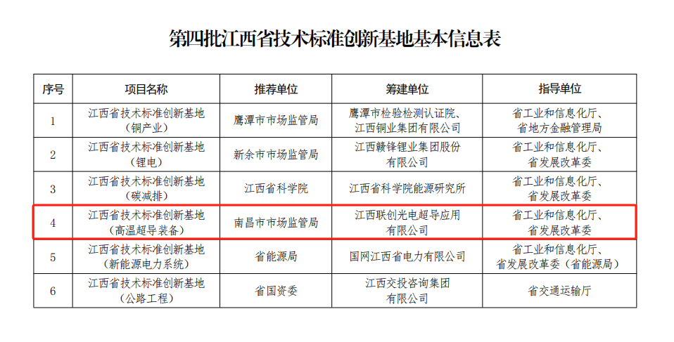 近日,省市場監(jiān)管局印發(fā)《關(guān)于同意籌建第四批江西省技術(shù)標(biāo)準(zhǔn)創(chuàng)新基地的通知》,同意江西聯(lián)創(chuàng)光電超導(dǎo)應(yīng)用有限公司牽頭籌建江西省技術(shù)標(biāo)準(zhǔn)創(chuàng)新基地(高溫超導(dǎo)裝備),這是我市獲批籌建的第2個省級技術(shù)標(biāo)準(zhǔn)創(chuàng)新基地項(xiàng)目。