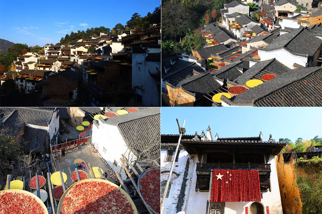 每當(dāng)日出山頭,晨曦初照,整個山間村落間,那飽經(jīng)滄桑的徽式民宿的土磚外墻與長長木架上,圓圓的竹匾里五彩繽紛的豐收果實排列組合,繪就出“曬秋”農(nóng)俗景觀,甚是壯觀。